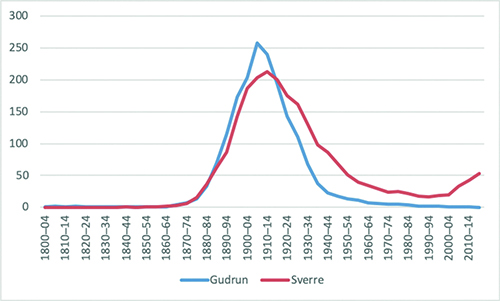 Elles har vi sidan 1990-åra kunna registrere at foreldre kallar opp barna etter oldeforeldra eller tippoldeforeldra. Renessansenamnet Sigrid er eit godt døme på dette. Sigrid var på topp rundt år 1900, gjekk så tilbake fram til namnet byrja å stige att i 1990-åra. Og etter 2015 har Sigrid hatt ei bratt kurve oppover. Tilsvarande viser diagrammet for Sverre at også dette namnet nå er på veg opp. Når vil så morgondagens foreldre ta i bruk andre av dei renessansenamna som var populære rundt 1900? Kan Gudrun og Borghild få ein ny vår?