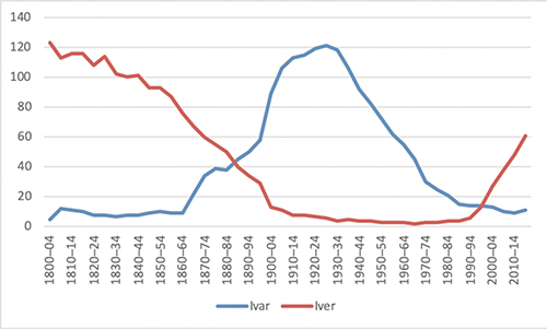 I dåpsboka er Ivar Aasen (1813–96) innskriven med fornamnet Iver, men i 1846 endra han Iver til Ivar, noko som var meir i samsvar med den norrøne opphavsforma Ívarr. I figuren som viser popularitetsutviklinga for Ivar og Iver, ser vi at Ivar var lite brukt tidleg på 1800-talet, og heller ikkje på 1840-talet, da Aasen gjekk over til Ivar, var denne varianten vanleg. Det var fyrst tidleg på 1860-talet at Ivar begynte å få vind i segla, og i perioden 1885–89 kryssar den stigande kurva for Ivar den nedgåande kurva for Iver. Ivar når så toppen i 1925–29 og fell deretter til eit botnnivå frå 1985 og fram til i dag. Iver derimot frisknar til liv på slutten av 1900-talet og kryssar den flate kurva til Ivar i perioden 1995–99. Kvifor kviknar så Iver til? Om vi ser bakover på kurvene til dei to variantane, oppdagar vi at det var lenge sidan Iver var i vinden, mens Ivar var svært vanleg på 1900-talet. Foreldre vil i dag gjerne velja namn som dei meiner skil seg noko ut, og for dei vil Iver framstå som eit meir særmerkt namn enn det vanlege Ivar, for rundt år 2000 levde det omtrent 11 gongar så mange menn med namnet Ivar som Iver i Noreg. Somme vil kanskje seia at Iver har eit visst dansk preg, men i Danmark er Ivar og Iver brukt omtrent like mykje, og Iver kan sjåast på som ein austlandsk variant utvikla av det norrøne Ívarr. Her har altså ein trykksvak a vorte til e etter opphavleg lang rotstaving i norrønt.