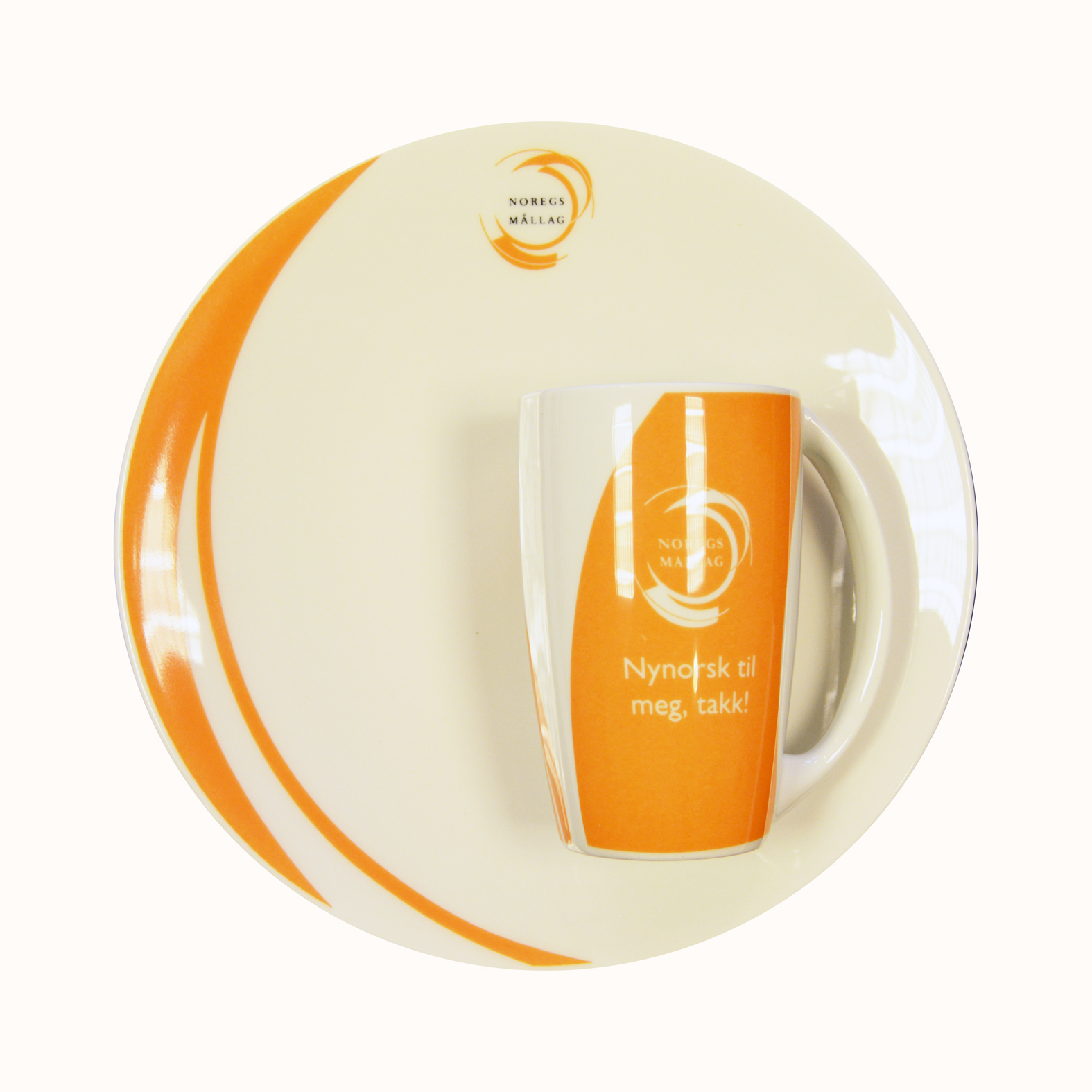 Tallerken og krus. Innskrifta «Nynorsk til meg, takk» på kruset.