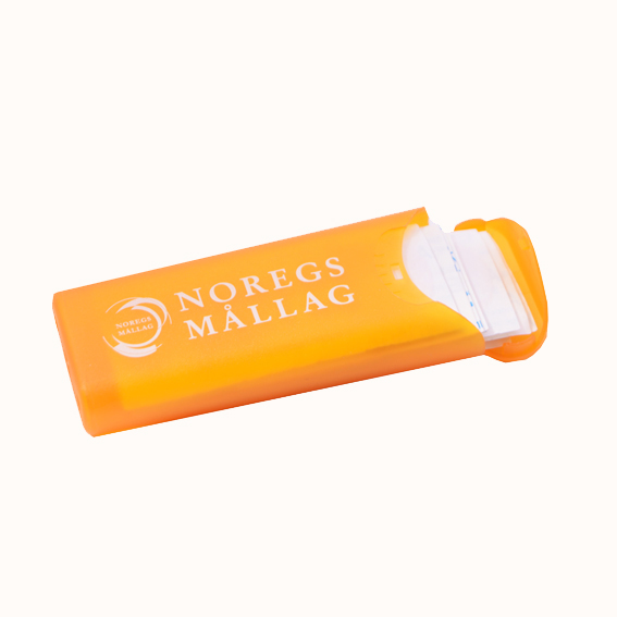 Boks med åtte plaster til å ha i sekk eller veske. Det er lett å fylle på med nye plaster, men boksen kan også nyttast til til dømes minnepinne, fiskekrokar eller drops.